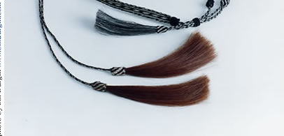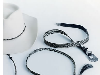 braided horsehair belt, hatband, and stampede strings braids are constructed with tail hair and tassels from the horse's mane