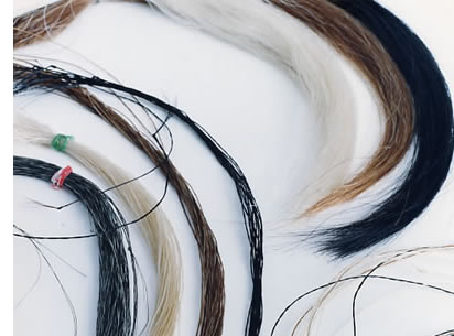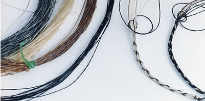 counterclockwise from top: tail hair, strands of several tail hairs twisted together, braids under construction