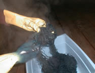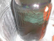 If you can stand the smell, a urine vat is the way to go for dyeing with Indigo. The process is quite simple: First, you collect a jar of urine. The more concentrated the better, so drinking lots of water, alcohol, or caffeine to increase production isn't advisable. Add the natural indigo to the urine, close the lid, and keep it in a warm location. I put mine outside with a 60 watt light bulb on it and partially cover the jar with a towel. This works fine for the climate I'm in. For the first few days it's necessary to reach in with a gloved hand and break up the clump of indigo. Be careful to not agitate the liquid as you don't want to introduce oxygen. When the solution is sufficiently reduced you'll see a coppery film on the surface as in the first photo. You are now ready to dye! Wet your fiber and gently introduce it into the vat. With your gloved hand, lightly massage the fiber for about fifteen minutes.The fiber will be a yellowish-green color inside the jar but once it contacts air, it will oxidize to dark blue. Separate the fiber/yarn well so that it can oxidize completely and let it rest for about thirty minutes between each dip. You can dip as many times as your vat will allow though mine usually gets 'tired' after about four dips. A way to tell if your vat is tired is to dip a small piece of cotton. If it looks gray after it has been rinsed in water, then you should stop and give the vat several days to reduce again. From time to time you'll need to add more indigo and/or urine but a vat should live for many years.