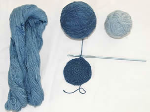 I'm crocheting a yarmulke for my little friend Ethan. I spun the California-grown, organic cotton yarn on a book charkha. I dyed it in an indigo urine fermentation vat